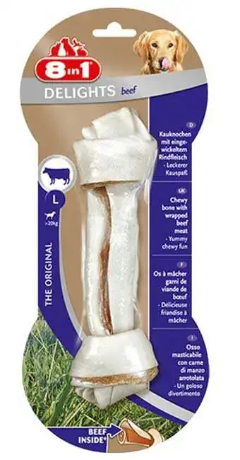 Biftek aroması sayesinde köpeğiniz severek tüketir. Köpeklerde diş sağlığını korumakla beraber tartar ve plak oluşumunu engelleyerek minimum seviyeye indirmektedir. Köpeklerde doğası gereği bulunan çiğneme isteği 8 in 1 ödül sayesinde giderilir ve köpeğiniz huzurlu olur. Paket içerisinde 1 adet kemik vardır.