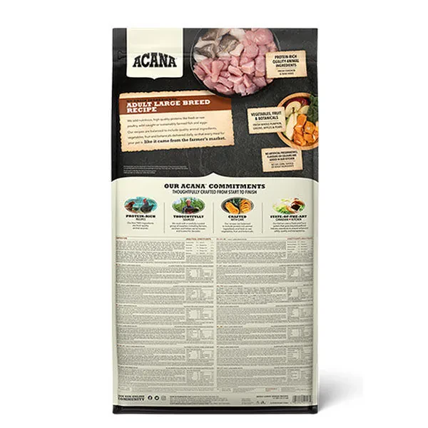 ACANA Adult Large Breed, tanıdığımız ve güven duyduğumuz kişiler tarafından yetiştirilen ve avlanan, insan tüketimine elverişli olduğu kanıtlanan ve sonrasında ödüllü mutfaklarımıza kadar her gün taptaze olarak ulaştırılan, eşi benzeri olmayan çeşitlilikte yöresel içerikler içerir!