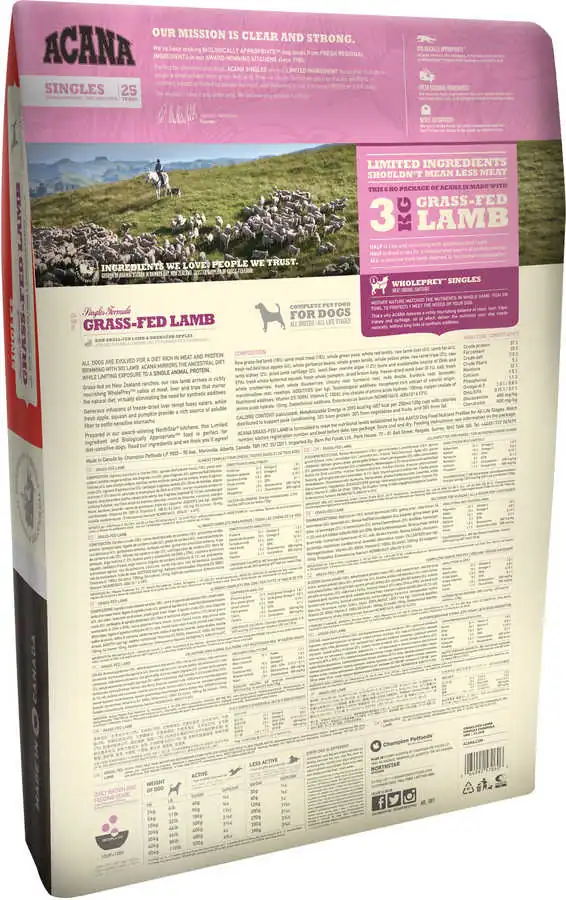 Acana tahılsız kuzu etli köpek maması, tek protein kaynağı olarak Kuzu eti kullanılmıştır. Yeni Zelanda Kuzu eti hassas deriye sahip köpekler için büyük bir çözüm kaynağı olarak sunulmuştur.