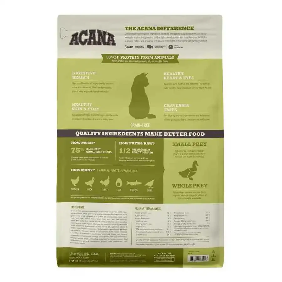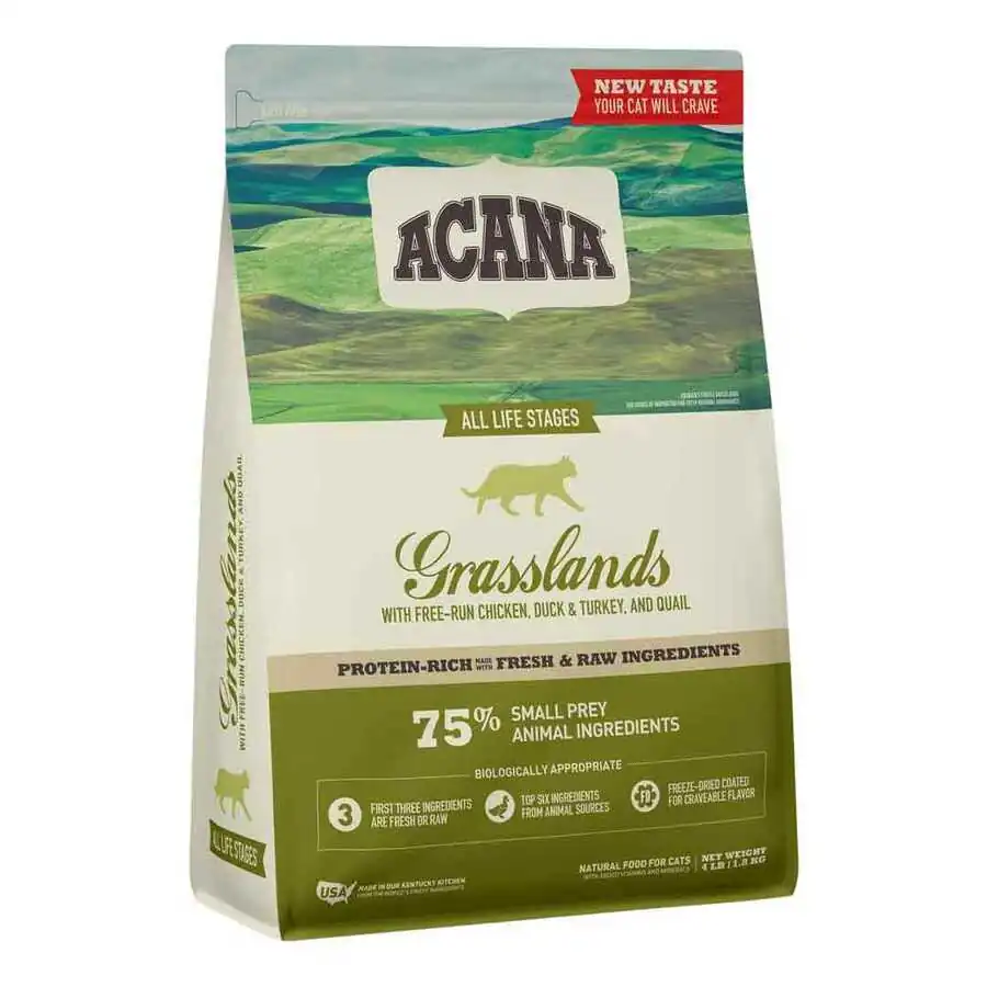 Kediler, hayvansal protein açısından zengin bir diyete ihtiyaç duyarlar. ACANA Grasslands, WholePrey oranlarında et, organ, kıkırdak ve kemikten oluşan serbest dolaşan tavuk, hindi ve ördek, kafessiz yumurtalar ve serbest yakalanmış balıklarla doludur.