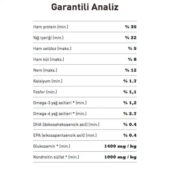Ham protein 35%, Ham yağ 22% , Ham lif 5% , Ham kül 8% , Kalsiyum / Fosfor 1.7%/1.1% , Omega-6 yağ asitleri 2.7%, Omega-3 yağ asitleri1.2%, DHA / EPA0,4%/0,4% , Glukozamin 1400mg/kg , Kondroitin 1000mg/kg