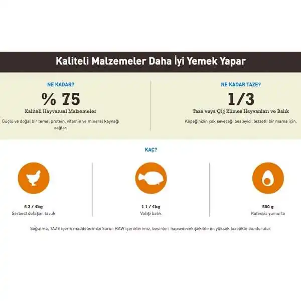 Taze tavuk eti (% 16), tavuk eti (% 16), hindi eti (% 15), kırmızı mercimek, tavuk yağı (% 7), bütün yeşil bezelye, taze tavuk sakatatı (karaciğer, kalp, böbrek) (% 4) , ringa balığı eti (% 4), ringa balığı yağı (% 4), taze bütün yumurta(% 4), taze bütün pisi balığı (% 3), güneşte kurutulmuş kaba yonca, tarla fasülyesi, yeşil mercimek, bütün sarı bezelye, taze tavuk kıkırdağı (% 2), kurutulmuş kahverengi yosun, taze bütün kabak, taze bütün balkabağı, bütün yabani havuç, taze lahana, taze ıspanak, taze hardal yeşilliği, taze şalgam, taze bütün havuç, taze kırmızı lezzetli elma, taze bartlett armutu, dondurularak kurutulmuş tavuk karaciğeri, dondurularak kurutulmuş hindi karaciğeri, taze bütün kızılcık, taze bütün yaban mersini, hindiba kökü, zerdeçal, taze süt devedikeni, dulavratotu kökü, lavanta, hatmi kökü, kuşburnu. Besinsel takviyeler(kg başına) : amino asit hidrat, çinko şelat:100mg.Zooteknik takviyeler: Enterococcus faecium NCIMB10415:600X10^6 CFU.