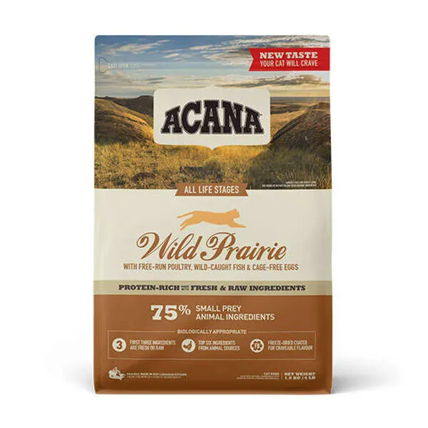 Doğa Ana kedileri bir etobur olarak evrimleştirmiş, çeşitli hayvansal yağlar ve proteinler açısından zengin bir beslenme ile gelişmesini tasarlamıştır.Piyasada bulunan bir çok kedi mamasında karbonhidrat ve tahıl bulunmaktadır.Bu nedenle Acana Wild Prairie kedi maması, içeriğindeki bölgemiz yaylalarında bulunan çiftliklerde yetişen hormonsuz tavuk ve yumurtalarla, Batı Kanada'nın derin soğuk sularında yakalanmış Kanada Göl alabalığı ve Kuzey Levreği gibi dondurulmadan ve koruyucu katkı maddesi içermeyen hergün taze olarak getirilen çok çeşitli ve en kaliteli hayvan içerikleri ile öne çıkmaktadır.