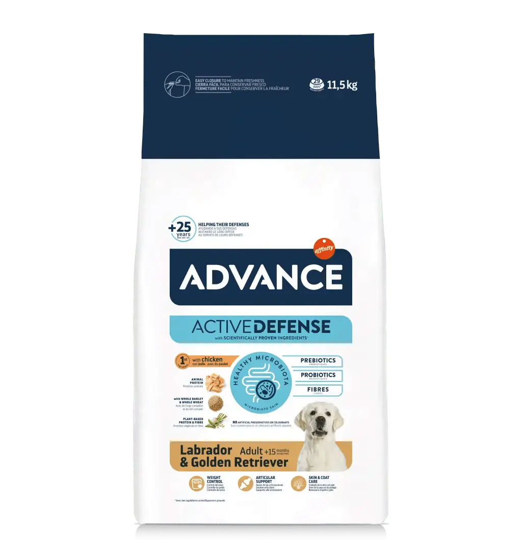 15 aydan itibaren Yetişkin Labradorlar ve Golden Retrieverlar Advance Labrador & Golden Retriever, Labrador ve Golden Retriever ırklarının bakımı için özel olarak formüle edilmiştir. Yüksek lif içeriği ve orta kalorili tarifi sayesinde kilo kontrolüne yardımcı olur. Eklem kıkırdağının korunmasına yardımcı olan kondroitin ve glukozamin ile kalp kasının normal işleyişine katkıda bulunan taurin ve L-karnitin içerir. Ayrıca omega 3 ve omega 6 yağ asitleri, biyotin ve çinko sayesinde sağlıklı cilt ve parlak tüylere de katkıda bulunur. İçindekiler: tavuk (%17), kurutulmuş kümes hayvanı proteini, arpa (%10), buğday unu, tam buğday (%6), mısır glüteni unu, bezelye (%4), mısır, hayvansal yağ, hidrolize hayvansal protein, pancar küspesi , bitkisel lif, balık yağı, kurutulmuş yumurta, maya, plazma proteinleri, potasyum klorür, tetrasodyum difosfat, soya fasulyesi yağı, kurutulmuş havuç (%0,1), tuz, Glukozamin, kondroitin sülfat, biyoflavonoidler açısından zengin narenciye özü. , inorganik madde (%6,0), kalsiyum (%1,0), fosfor (%0,9), nem (%9). Mineraller: demir (86 mg/kg), iyot (1,44 mg/kg), bakır (9 mg/kg), manganez (40 mg/kg), çinko (205 mg/kg), selenyum (0,11 mg/kg). Besin katkı maddeleri (1 kg için): A vitamini (30000 IU), D3 vitamini (2000 IU), E vitamini (alfa-tokoferol) (680 mg), C vitamini (500 mg), demir monohidrat sülfat (260 mg), potasyum iyodür (1,88 mg), pentahidrat bakır sülfat (33,5 mg), monohidrat manganöz sülfat (120 mg), monohidrat çinko sülfat (560 mg), sodyum selenit (0,24 mg), Taurin (1950 mg), L-karnitin (250 mg), biyotin (0,25 mg), K vitamini (0,53 mg). Metabolize etme enerjisi: 3581 kcal/kg. Analitik bileşenler: Ham protein %29, Ham yağ %14, Ham lif %3,7, Ham Kül %6,5, Omega 3 %0,5; Omega 5 %2,6