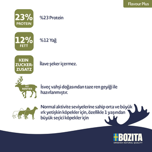 Tavuk ve geyik eti içeriğiyle öne çıkan Bozita Flavour Plus, yetişkin köpeklerin kas yapısını korumasına destek olur. Taze hazırlanmış et kaynakları sayesinde yüksek sindirilebilirliğe sahip olan bu mama, günlük protein ihtiyacını karşılamaya yardımcı olur.