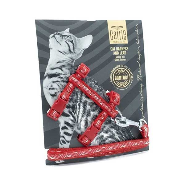 CATTİE DESENLİ KEDİ GÖĞÜS & GEZDİRME TAKIMI KIRMIZI 1X25-40CM