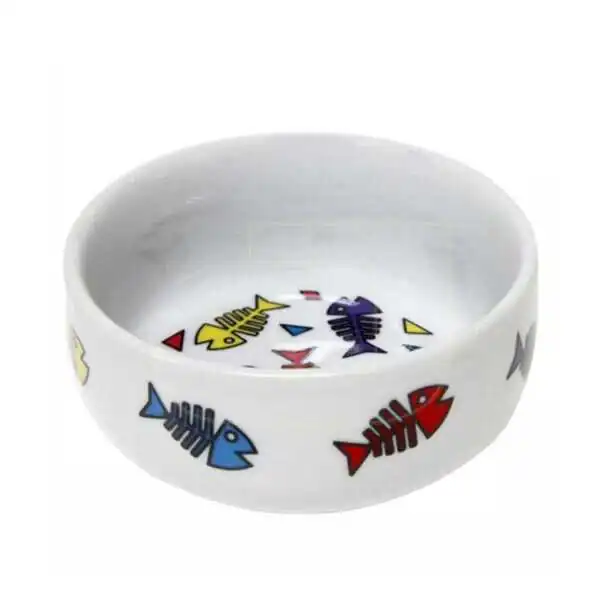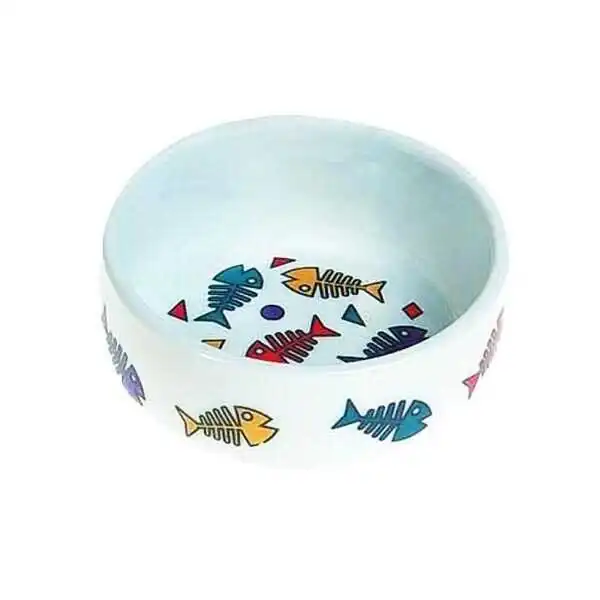 Kediler, küçük ırk köpekler ve yavru köpekler için, kullanım kolaylığı sağlayan, hijyenik, balık desenleriyle süslenmiş, porselen mama kabıdır.