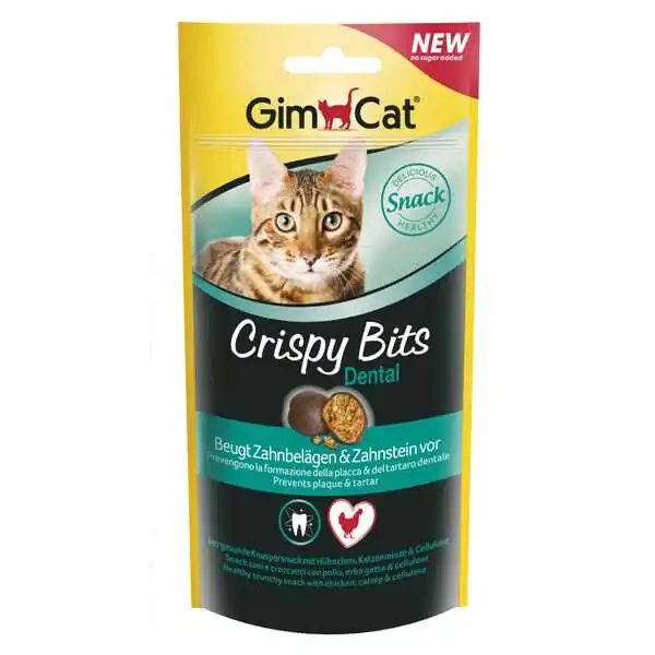 Gimcat Crispy Bits Dental Kedi Ödülü, plak ve tartarı önlemeye yardımcı olan selüloz temizleme parçacıklarının yanı sıra tavuk ve nane içeren gevrek bir atıştırmalıktır.