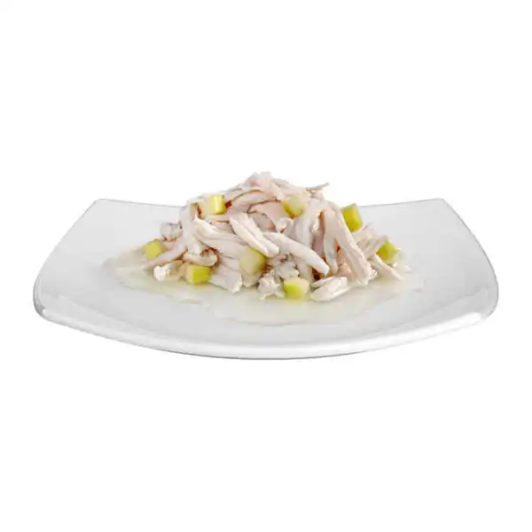 Gevrek ve protein açısından zengin tavuk fileto parçaları, yavaşça buharda pişirilmiş elma parçaları ile rafine edilmiştir.