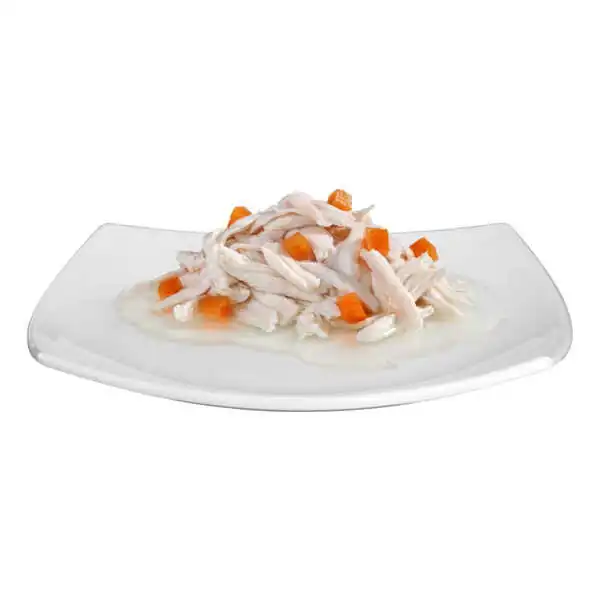 Gevrek ve protein açısından zengin tavuk fileto parçaları, yavaşça buharda pişirilmiş havuç parçaları ile rafine edilmiştir.