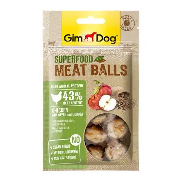 Gimdog Superfood Et Topları, Kinoa ve Elma içeren yüksek kaliteli tavuk ile kombine edilmiştir. Elma doğal vitamin, mineral ve antioksidan kaynağıdır. Kinoa protein açısından zengindir ve sağlığa yararlı etkileri vardır. Tavuklu lezzetli atıştırmalıklar için sadece bir hayvansal protein kaynağı kullanılmıştır.