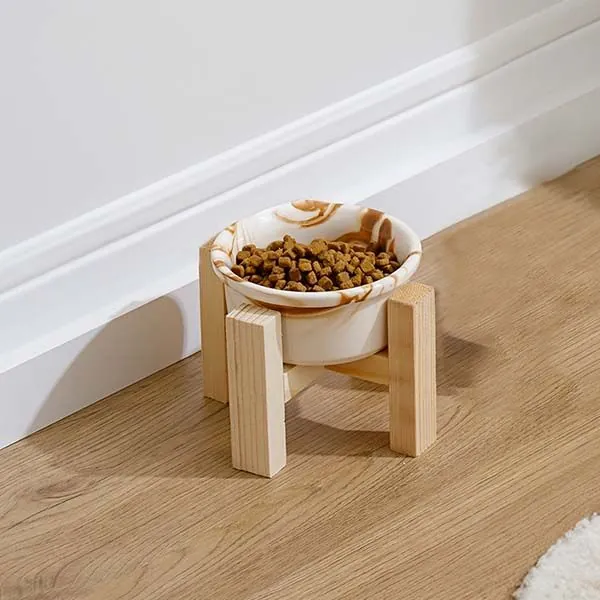 Herniks Ahşap Ayaklı Seramik Kedi Köpek Tekli Mama ve Su Kabı 12x10cm - Mermerkahve