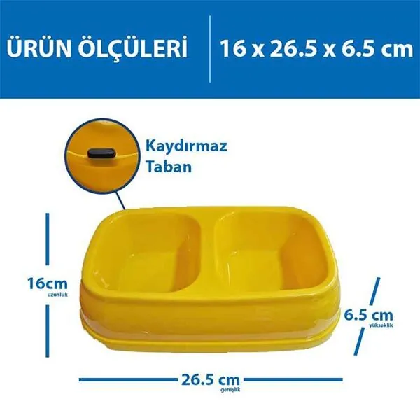 16 cm uzunluk, 26.5 cm genişlik ve 6.5 cm yükseklik ölçülerine sahip olan bu mama ve su kabı, evcil dostunuzun beslenme ihtiyaçlarını konforlu bir şekilde karşılar. Kaydırmaz tabanı sayesinde kabın yerinden oynamasını engeller.
