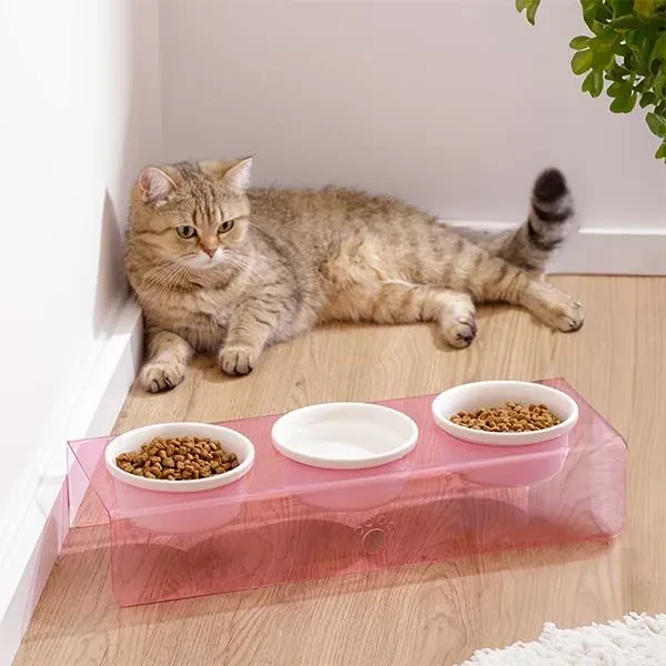 Herniks Pati Desenli Şeffaf Pleksi Ve Seramik Üçlü Mama Kabı 44x15 Cm - Pembe