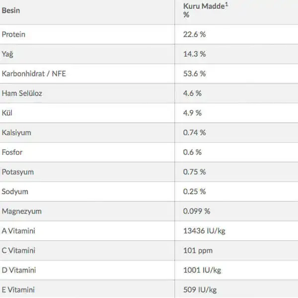 A vitamini (13,437 IU), D3 vitamini (1000 IU), E vitamini (750 mg), C vitamini (90 mg), beta-karoten (1,5 mg), demir (75,2 mg), iyot (1,2 mg), bakır (7,4 mg) ), manganez (7,8 mg), çinko (156 mg), selenyum (0,2 mg).