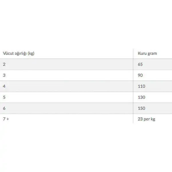 Bu aralıklar yalnız bir başlangıç noktasıdır çünkü evcil hayvanların ihtiyaçları değişiklik gösterir. Verilecek miktarı ideal vücut ağırlığına göre ayarlayınız.