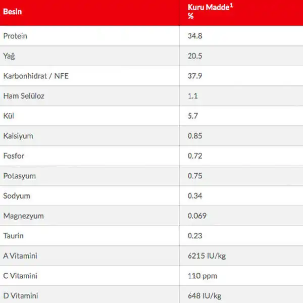 Tavuklu (minimum Tavuk %37, Tavuk ve Hindi birlikte %50): Pirinç unu, tavuk ve hindi unu, mısır unu, mısır gluteni unu, hayvansal yağ, kurutulmuş yumurta, bitkisel yağ, dijest, ton balığı unu, potasyum klorid, DL-metionin, tuz, kalsiyum karbonat, taurin, vitaminler ve iz elementler. Doğal olarak karıştırılmış tosoferoller, sitrik asit ve kuşburnu özü ile korunmaktadır.