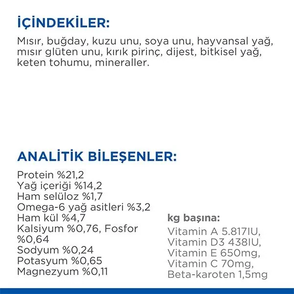İçerik: Kuzu Etli ve Pirinçli (minimum %26 Kuzu eti; minimum %4 Pirinç): Mısır unu, kuzu eti, soya fasulyesi unu, hayvansal yağ, mısır gluteni unu, pirinç unu, dijest, bitkisel yağ, keten tohumu, L-lisin hidroklorür, tuz, potasyum klorür, DL-metionin, taurin, L-triptofan, vitaminler ve iz elementler. Tokoferoller, sitrik asit ve biberiye esansı karışımı ile doğal olarak korunmuştur.