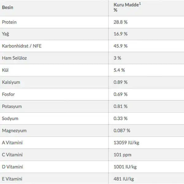 A vitamini (13.059 IE / kg), D3 vitamini (1.001 IE / kg), E vitamini (730 IE / kg), C vitamini (90mg / kg), beta-karoten (1.5mg / kg), demir (69, 2 mg / kg), iyot (1,1 mg / kg), bakır (6,8 mg / kg), manganez (7,2 mg / kg), çinko (143 mg / kg), selenyum (0,2 mg / kg). mg), selenyum (0,2 mg).