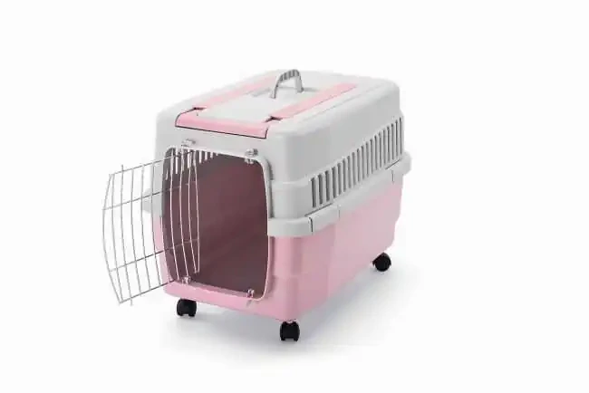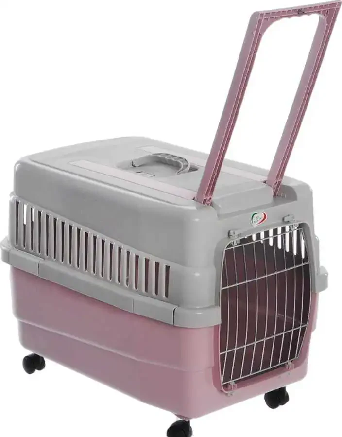 Köpek ve kediler için, metal kapılı kolay temizlenebilen, hijyenik, demonte olabilen, tekerlekli plastik taşıma kabıdır.