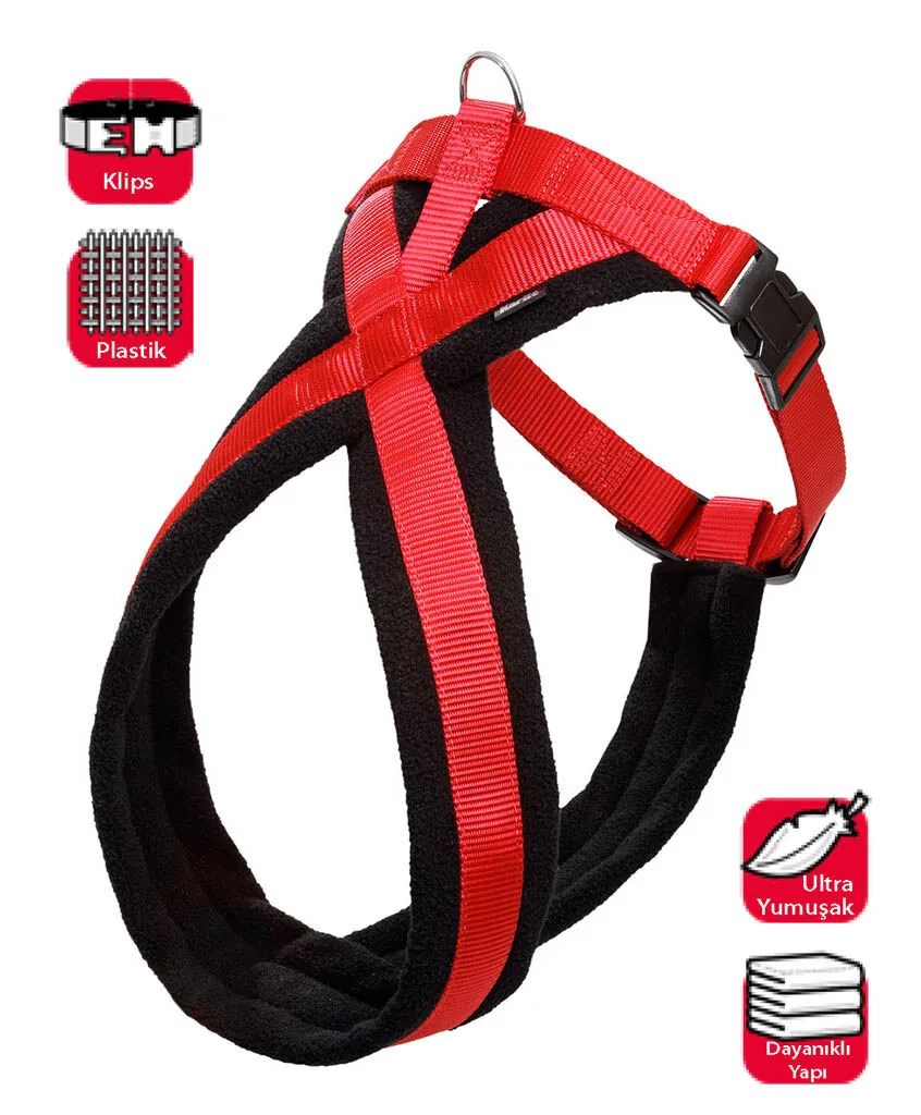 Ayarlanabilir göğüs tasması. Dayanıklı naylon materyalden imal. İç yüzeyi yumuşak. Metal parçalar kromdur. Uzunluk: 70-90 cm. Genişlik: 25 cm. Kırmızı - Siyah.