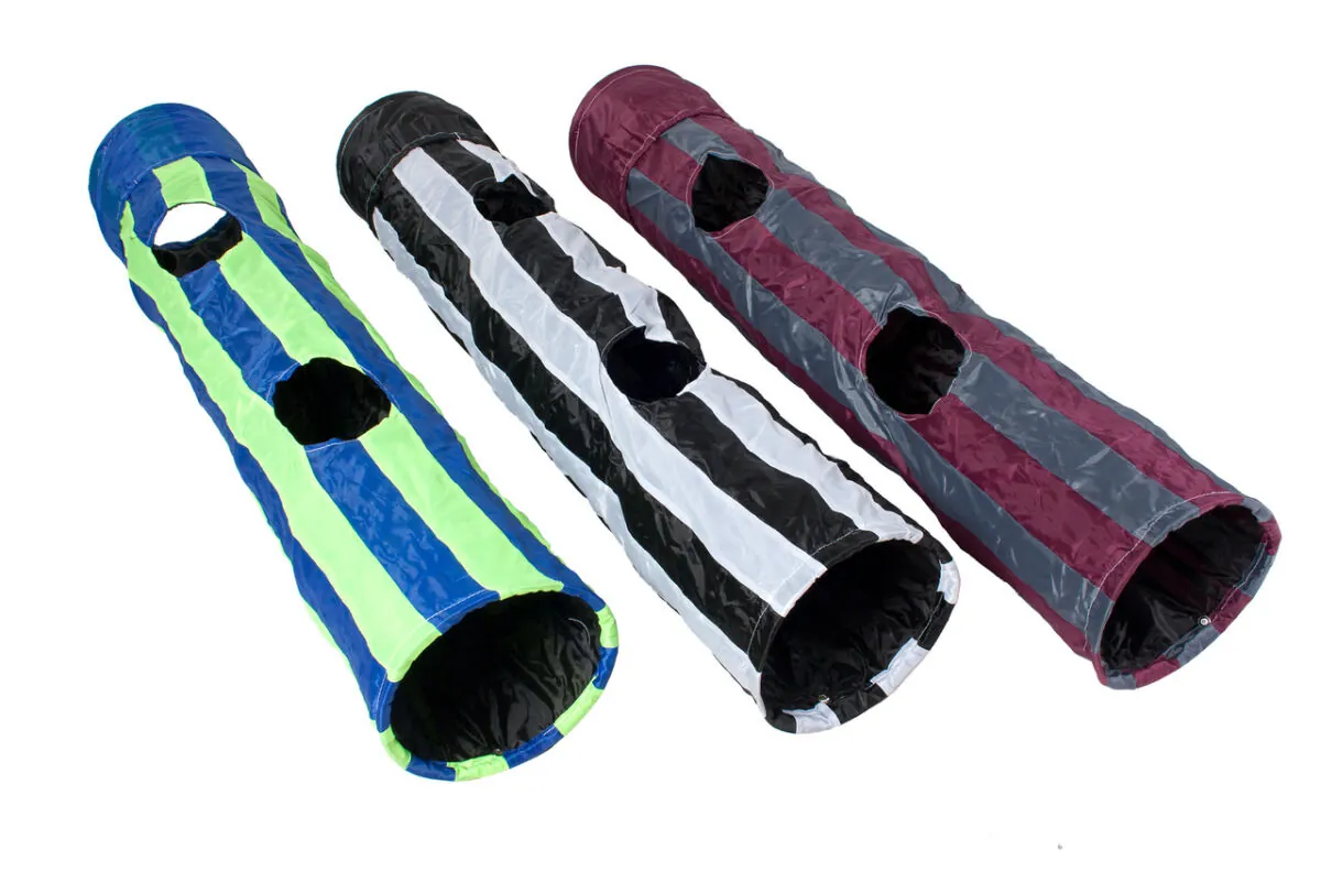 Çizgili desenli kedi tüneli. Dayanıklı naylon malzemeden. Katlanabilir. 136cm uzunluk. 25 cm çap. Çeşitli renklerde.