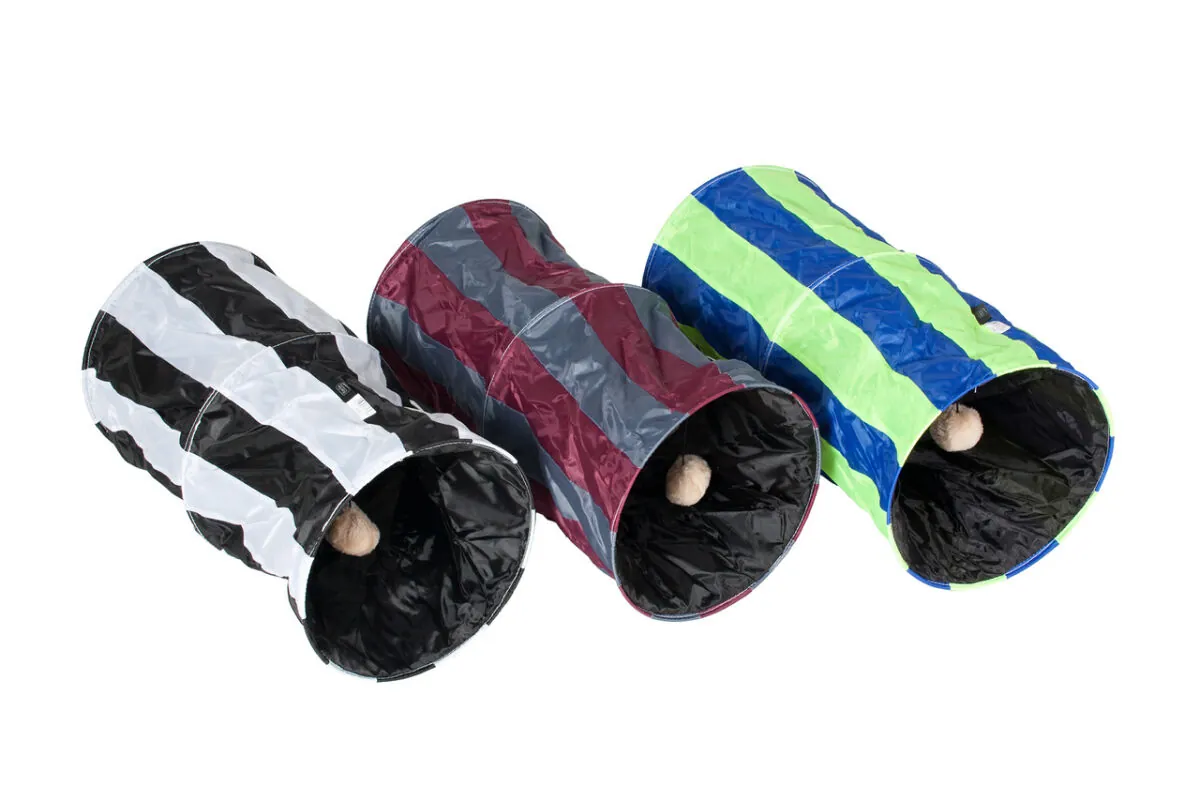 Çizgili kedi tüneli. Dayanıklı naylon malzemeden. Katlanabilir. 50 cm uzunluk. 25 cm çap. Çeşitli renklerde.