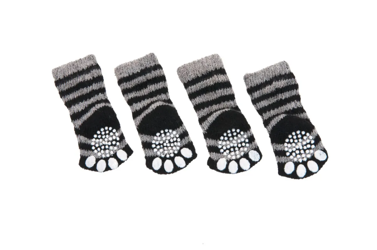 Kaydırmaz tabanlı, Siyah-Gri çizgili köpek çorabı. Dayanıklıdır. Patilerin sıcak kalmasına yardımcıdır. Paket içeriği: 4 adet çorap. 59*50mm. L boy.