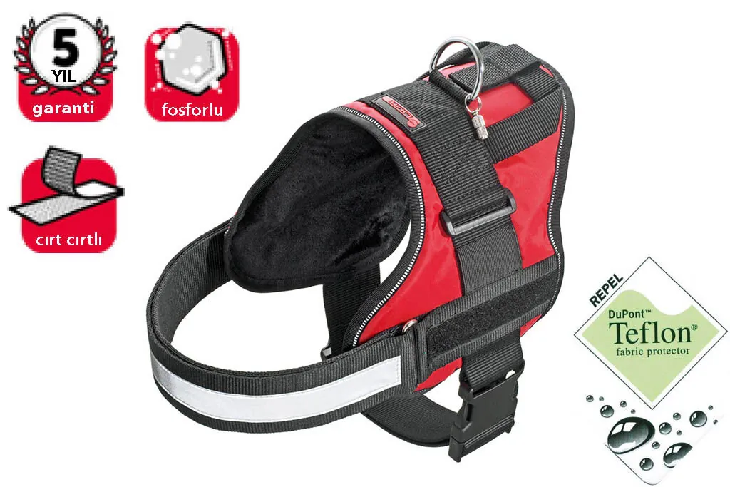 Ev dışı kullanım için uygun, kilit mekanizmalı, reflektörlü, metal parçaları krom kaplama, aşırı sıkmayı önleyici mekanizmaya sahip teflon göğüs tasması. İsimliği vardır. Kir ve toza karşı dayanıklıdır; uzun yıllar boyunca yeni görünümünü kaybetmez. 44-50 cm uzunluk. 25 mm kalınlık. XS boy. Kırmızı.