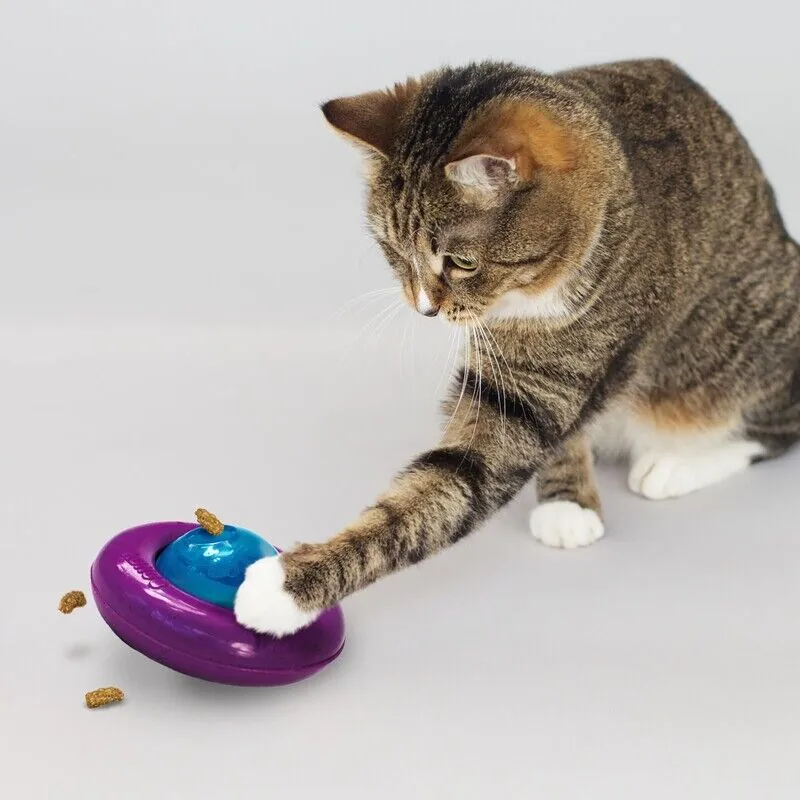 Kong Infused Cat Gyro iç tarafında buluna hazneye kedinin günlük mama ihtiyacını koyabileceğiniz veya kedi ödülü koyarak kedinizin uzun süre zevkli ve heyecanlı vakit geçirmesini sağlayabileceğiniz bir kedi oyun topudur. İç bölümün etrafında yer alan ve topun gelişigüzel ama dengeli harekete etmesini sağlayan dış tarafı içerisindeki zilin çıkardığı ses ile kedi hem işitsel hemde koku ile uyarılacak, kedi oyun topu ile zevk ile oynayacaktır. Ayrıca oyuncak içerisindeki kediotuda kedinin dikkatini sürekli oyuncak üzerine çekecektir.