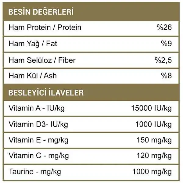İşlenmiş Hayvansal Protein (%23), Buğday (%24,08), Mısır (%20), Hayvansal Yağ (%3), Bonkalit (%8), Somon Unu (%4), Somon Yağı (%2), Mısır Gluteni (%5), Kurutulmuş Şeker Pancarı (%4), Ciğer Aroması (%3), Balık Aroması (%3), Tuz (%0.3), Keten Tohumu (%0.1), Kurutulmuş Bira Mayası (0.50), Taurin (%0.01), Koruyucular ve Antioksidanlar (%0.01 – E320 & E321)