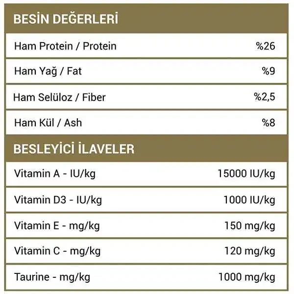 1000 mg/kg taurin içeriğiyle kalp ve göz sağlığını korurken, zengin vitamin ve mineral katkıları bağışıklığı destekler.