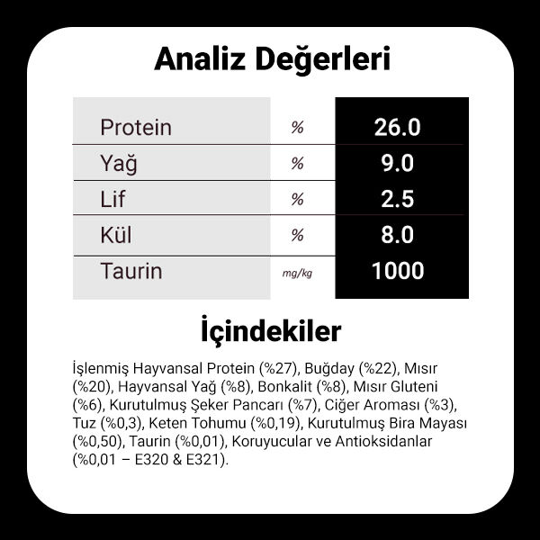 Ham Protein: %26 Ham Yağ: %9 Ham Lif: %2,5 Ham Kül: %8