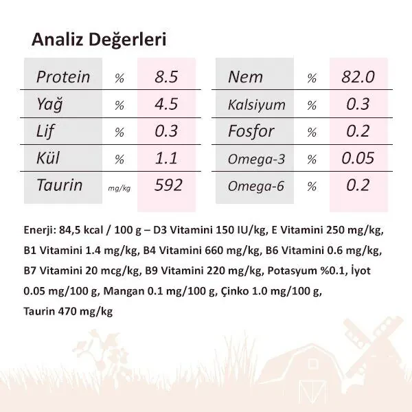 Et ve et türevleri – %39 (tavuk %22, dana eti %17), bitkisel protein ekstraktı, kurutulmuş pancar posası, amino asitler, tuz, mineraller, somon yağı, vitaminler, kalsiyum karbonat.