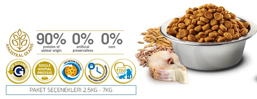 BİLEŞİMİ: Taze morina balığı (%24), kurutulmuş morina balığı (%24), balık yağı (ringa balığı), kılçıksız buğday (%10), yulaf (%10), kurutulmuş pancar posası, bitkisel bezelye lifi, kurutulmuş havuç, kurutulmuş yonca, inulin, fruktooligosakkarid, maya ekstratı (mannan‐oligosakkaritl kaynağı), kurutulmuş tatlı portakal (%0,5), kurutulmuş elma, kurutulmuş nar, kurutulmuş ıspanak, fisilyum (%0,3), kurutulmuş yaban mersini, sodyum klorür, kurutulmuş bira mayası, zerdeçal kökü (%0,2), glukozamin, kondroitin sülfat.