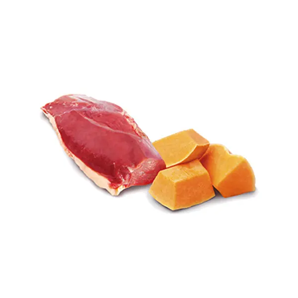 Ördek filetosu (% 30), tavuk, ringa balığı, balkabağı (% 5), haşlanmış tavuk yumurtası, balık yağı, tatlı patates, fruktooligosakkaritler, kolin klorür, kondroitin sülfat, glukozamin, vitaminler, mineraller.