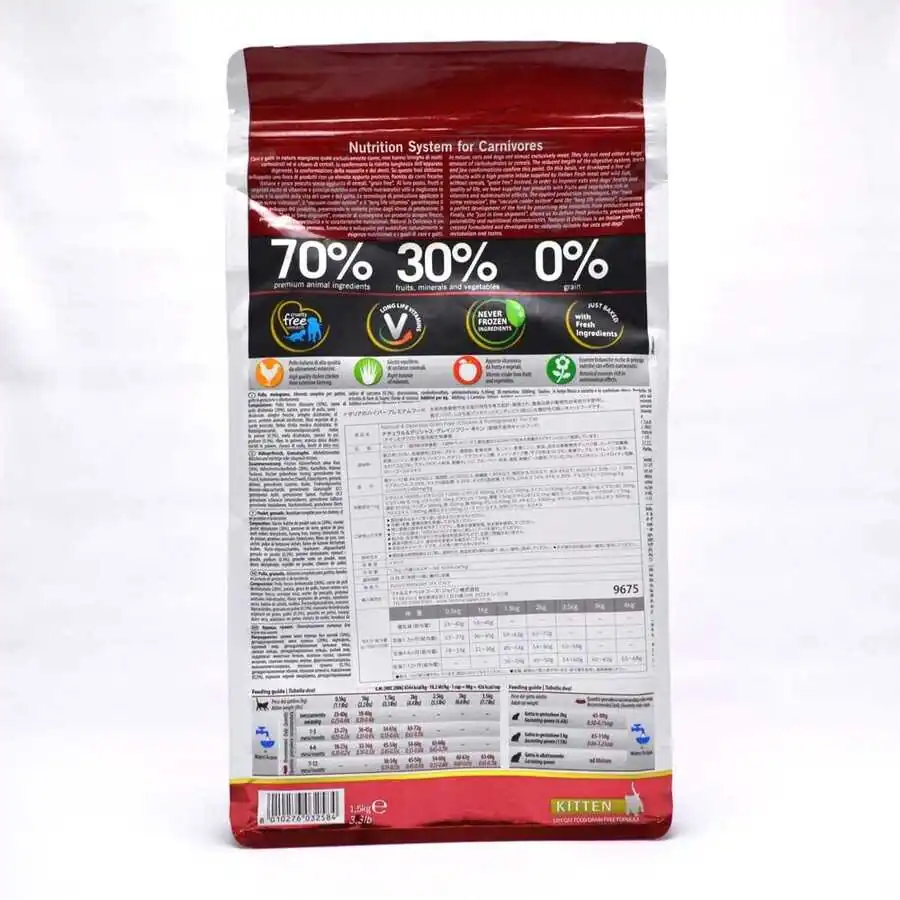İçerik: kemiksiz tavuk (%30), kurutulmuş tavuk proteini (%28), tatlı patates, tavuk yağı, kurutulmuş yumurta, ringa balığı, kurutulmuş ringa balığı proteini, balık yağı (ringa balığı), bezelye lifi, kurutulmuş havuç, yonca, inulin, fruktooligosakkarit, maya ekstratı (mannooligosakkarit kaynağı), kurutulmuş nar (%0.5), kurutulmuş elma, kurutulmuş ıspanak, fisilyum kabukları ve tohumları (%0.3), kurutulmuş tatlı portakal, kurutulmuş yaban mersini, sodyum klorür, kurutulmuş bira mayası, zerdeçal (%0.2), aloe vera ekstraktı.