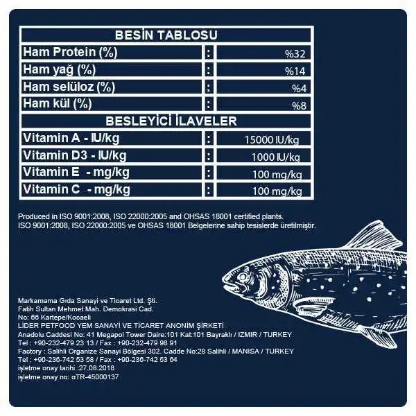 İşlenmiş Hayvansal Proteini, Somon, Hamsi, Somon Yağı, Hamsi Yağı, Mısır, Tavuk Yağı, Pirinç, Kurutulmuş Şeker Pancarı, Ciğer Aroması, Peynir Altı Suyu Tozu, Ksilo-Oligosakkarit, Kuru Bira Mayası, Keten Tohumu, Tuz, Yucca Schidigera, Doğal Koruyucular, Antioksidanlar