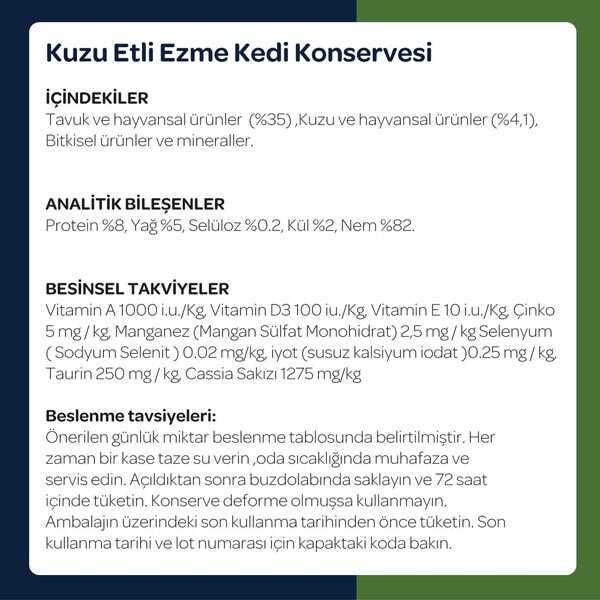 Mineral ve vitaminlerle zenginleştirilmiş leziz Obivan Kuzu Etli Ezme Yetişkin Kedi Konservesi, tüm ırk ve yaştan kediler için dengeli, sağlıklı ve günlük aktiviteleri için gerekli enerji ihtiyacını karşılayan tam bir besindir.