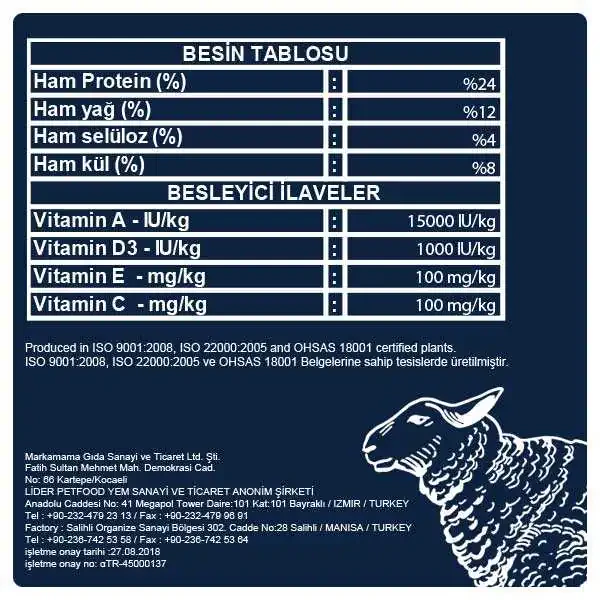 İşlenmiş Kuzu Proteini, İşlenmiş Hayvansal Proteini, Mısır, Tavuk Yağı, Pirinç, Şeker Pancarı, Ciğer Aroması, Peynir Altı Suyu Tozu, Vitaminler ve Mineraller, Ksilo-Oligosakkarit, Kuru Bira Mayası, Keten Tohumu, Tuz (%0,36), Yucca Schidigera, Yaban Mersini, Koruyucular ve Antioksidanlar