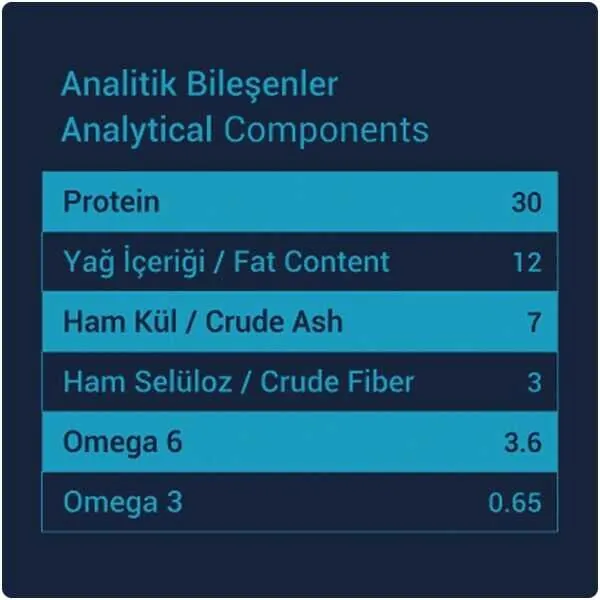 Gerçek somon eti, karides ve hamsi unu kaynaklı %30 protein oranı ile sindirilebilirliği yüksek, lezzeti güçlü bir formül sunar.