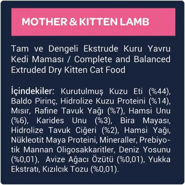 - Kurutulmuş kuzu eti (%44) ve hidrolize kuzu proteini (%14) ile zenginleştirilmiş içeriği, yavru kedinizin kas ve kemik gelişimini destekler ve enerji ihtiyacını karşılar.