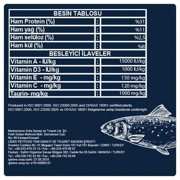 İşlenmiş Hayvansal Protein (%33), Buğday, Mısır, Hayvansal Yağ, Buğday Kepeği, İşlenmiş Somon Proteini, Somon Yağı, İşlenmiş Hamsi Proteini, Hamsi Yağı, Mısır Gluteni, Kurutulmuş Şeker Pancarı, Ciğer Aroması, Balık Aroması, Tuz, Keten Tohumu, Kuru Bira Mayası, Taurin, Koruyucular ve Antioksidanlar