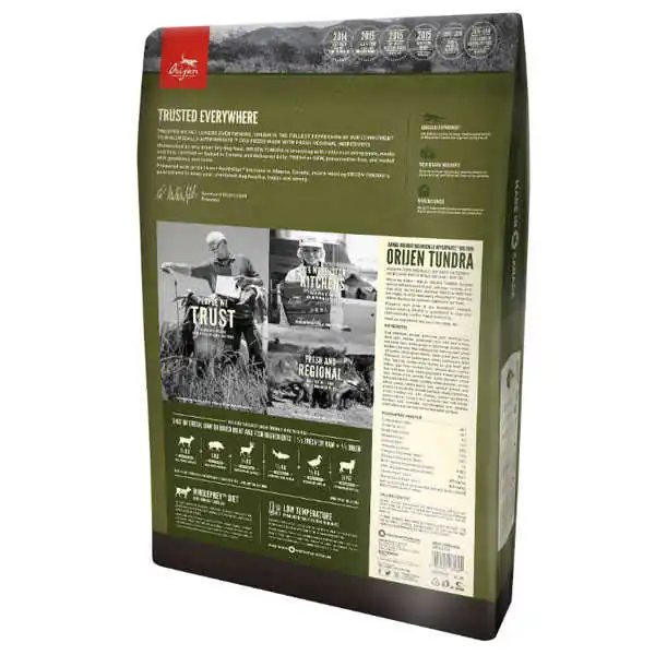 Orijen tundra tahılsız köpek maması, keçi, yaban domuzu, geyik, arktik alabalık, serbest dolaşan ördek ve alabalık etinden formülize edilmiştir. Tüm ırk ve yaşam evrelerindeki köpeklerin kullanabileceği şekilde üretilmiştir.