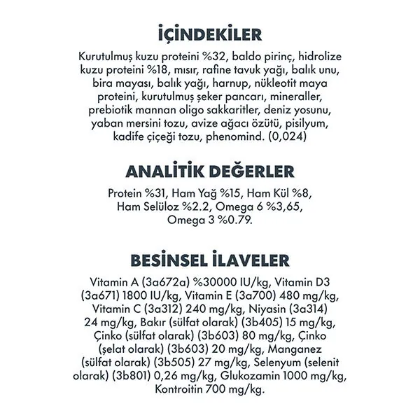 Kurutulmuş kuzu proteini (%32), baldo pirinç, hidrolize kuzu proteini (%18), mısır, rafine tavuk yağı, balık unu, bira mayası, balık yağı, harnup, nükleotit maya proteini, kurutulmuş şeker pancarı, mineraller, prebiotik mannan oligo sakkaritler, deniz yosunu, yaban mersini tozu, avize ağacı özütü, pisilyum, kadife çiçeği tozu, phenomind (0,024).