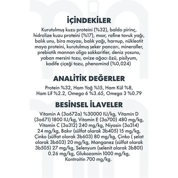 Kurutulmuş somon proteini (%38), baldo pirinç, balık unu (%17), mısır, rafine tavuk yağı, bira mayası, balık yağı, karides unu, harnup, nükleotit maya proteini, kurutulmuş şeker pancarı, mineraller, prebiyotik mannan oligo sakkaritler (MOS), deniz yosunu, yaban mersini tozu, avize ağacı özütü, pisilyum, kadife çiçeği tozu, phenomind (%0.024).