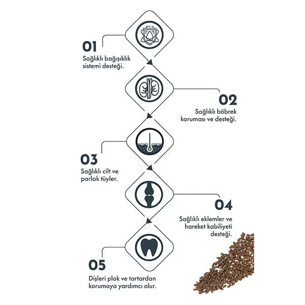 Somon proteini ve yaban mersini, tüy ve deri sağlığını destekleyen doğal antioksidan kaynaklarıdır. Bu içerikler bağışıklık sistemini güçlendirirken parlak ve sağlıklı bir tüy yapısına katkıda bulunur.