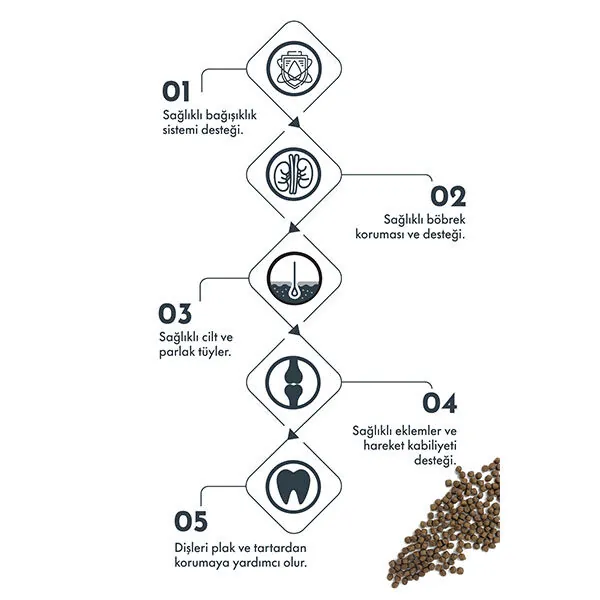 Yaban mersini, deniz yosunu ve avize ağacı özütü gibi bileşenler ile zenginleştirilen formül; antioksidanlar, vitaminler ve prebiyotik MOS sayesinde bağışıklık ve sindirim sağlığını destekler.