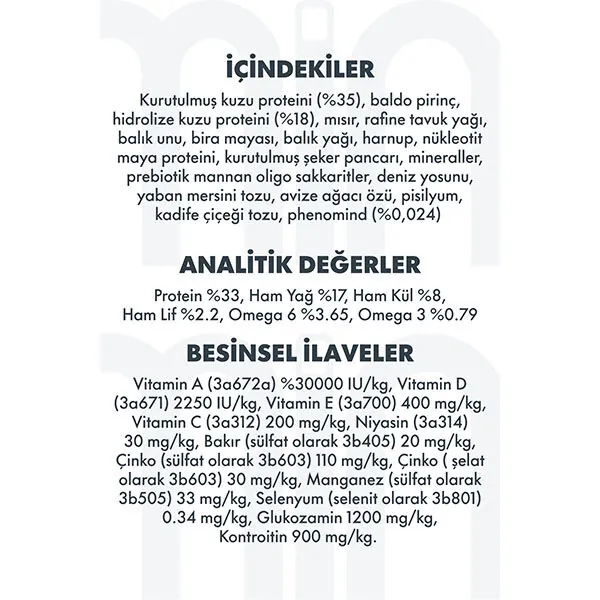 Kurutulmuş kuzu proteini (%35), baldo pirinç, hidrolize kuzu proteini (%18), mısır, rafine tavuk yağı, balık unu, bira mayası, balık yağı, harnup, nükleotit maya proteini, kurutulmuş şeker pancarı, mineraller, prebiyotik mannan oligo sakkaritler (MOS), deniz yosunu, yaban mersini tozu, avize ağacı özütü, pisilyum, kadife çiçeği tozu, phenomind (%0.024).