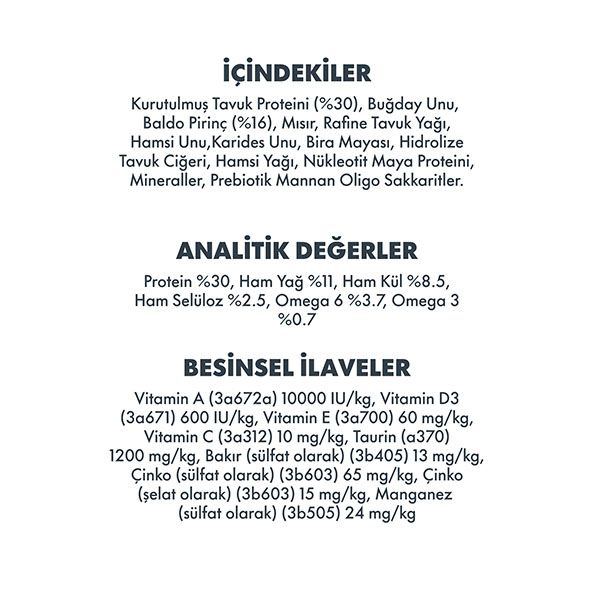 Kurutulmuş Tavuk Proteini (%30), Buğday Unu, Baldo Pirinç (%16), Mısır, Rafine Tavuk Yağı, Hamsi Unu, Karides Unu, Bira Mayası, Hidrolize Tavuk Ciğeri, Hamsi Yağı, Nükleotit Maya Proteini, Mineraller, Prebiotik Mannan Oligo Sakkaritler.